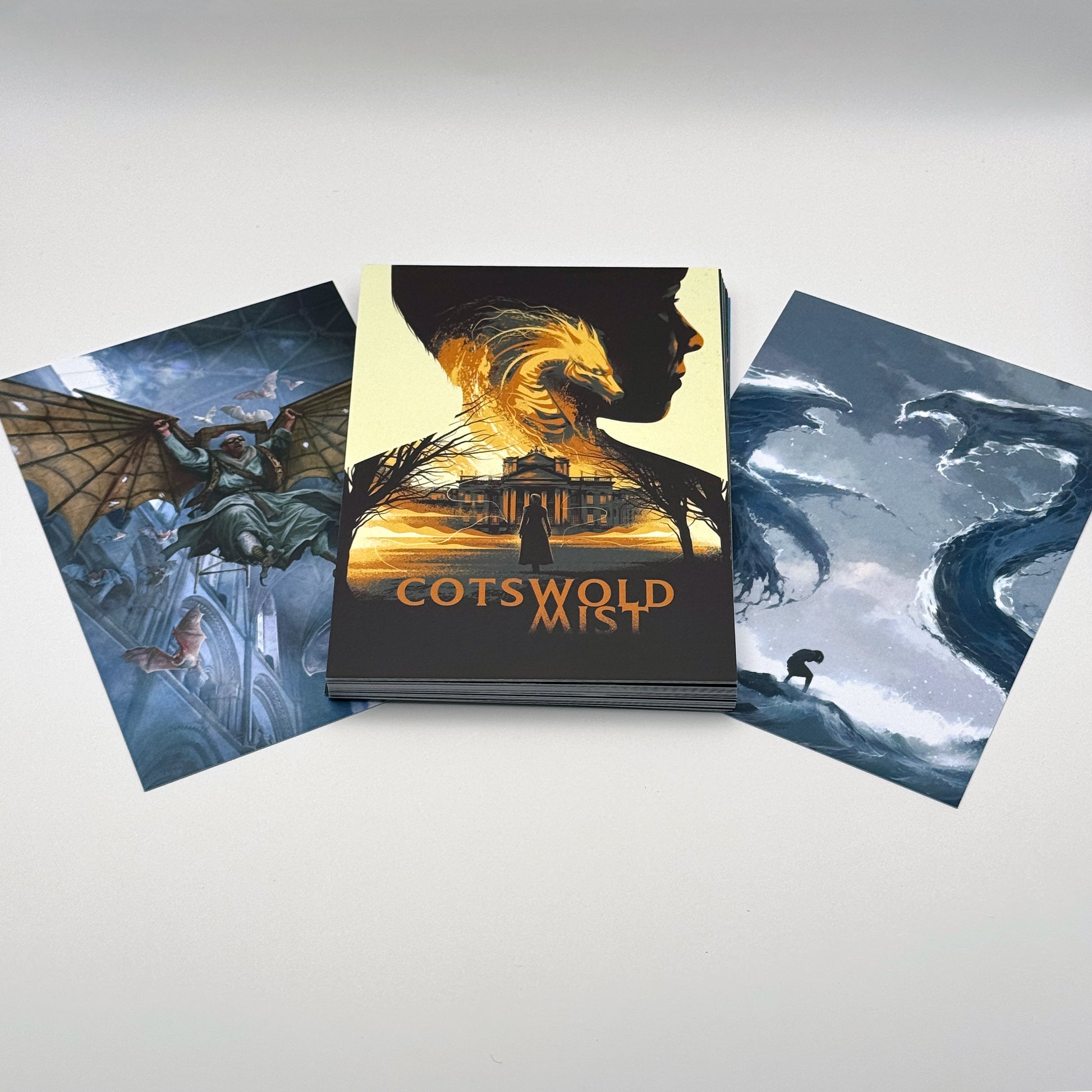 An exclusive collector’s boxset featuring 30 full-colour illustrated art cards, sized 150 × 75 mm, each showcasing original artwork from the world of Cotswold Mist. Printed on premium matt-coated card stock and presented in a bespoke box with a debossed Cotswold Mist logo, this set captures the hidden creatures, haunted places, and mist-shrouded beauty of the Cotswolds in a format designed to be displayed, handled, and treasured.